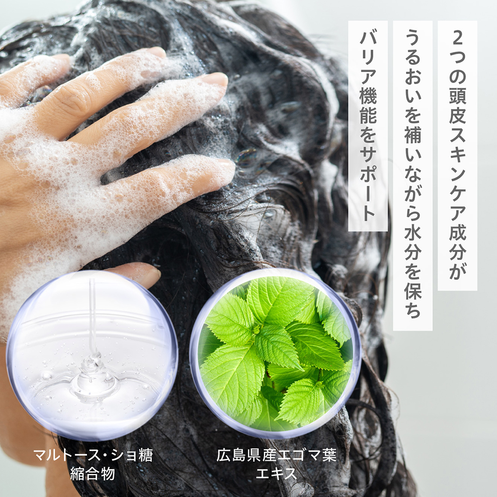 頭皮スキンケア成分「マルトース・ショ糖縮合物(オリゴ糖由来)*¹」と「広島県産エゴマ葉エキス*¹」を配合し、うるおいを補いながら水分を保ち、バリア機能をサポート。美髪の土台*²となる健やかな頭皮環境へ導きます。