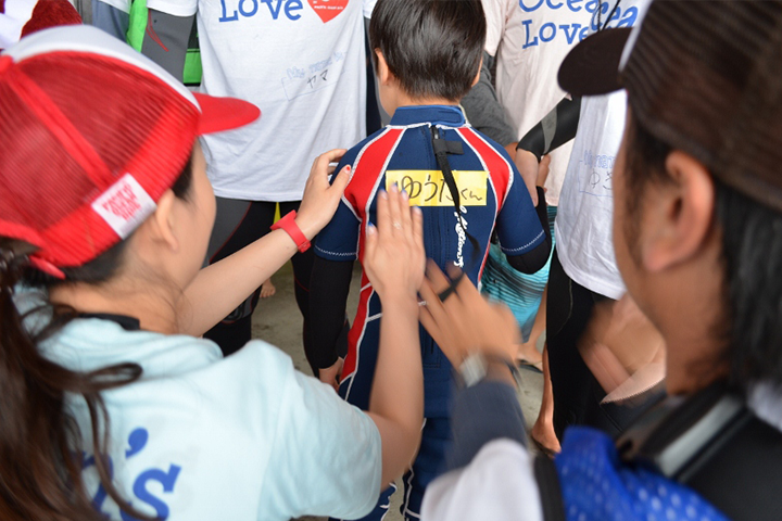 担当する子どもとコミュニケーションをとりながら、ウェットスーツに着替えるお手伝い。怪我のないよう、みんなでしっかりと準備体操。