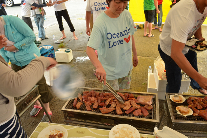 サーフィンの後、海に感謝してみんなでビーチクリーン。そしてランチタイム。BBQやロコモコ丼などを、みんなで美味しくいただきます。