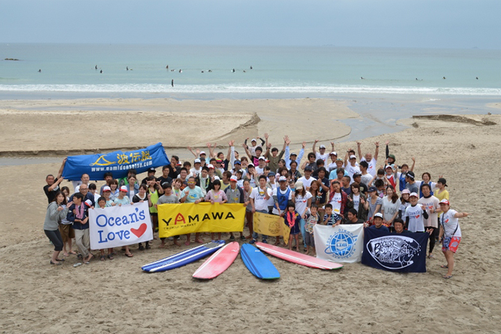 プロサーファーでもあるアンジェラ・磨紀・バーノンさんをお手本に、まずは砂浜で練習。その後、それぞれのペースで海へ。