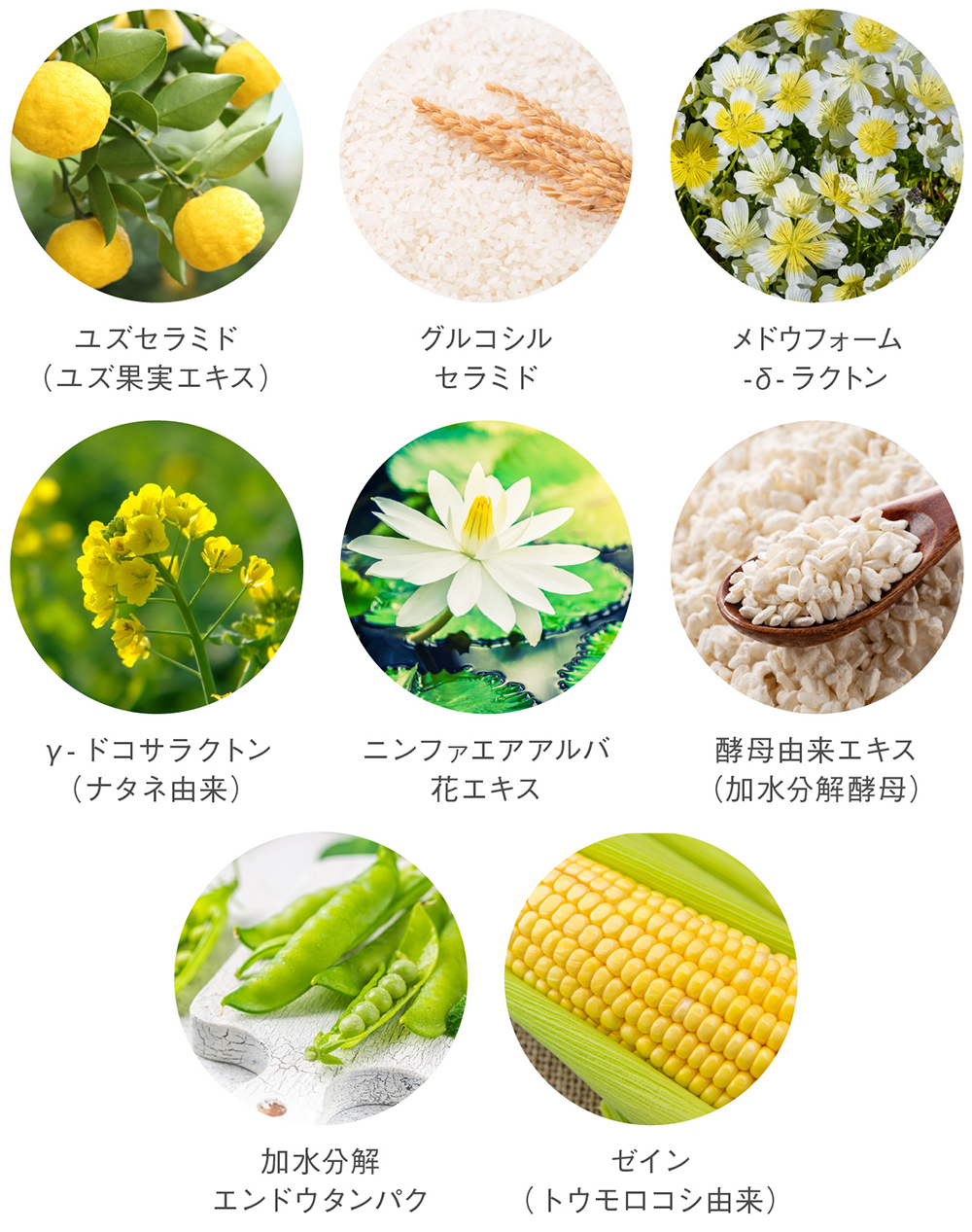 ユズセラミド*¹、グルコシルセラミド*²の2種のセラミドが水分をキープし、乾燥や広がりを防ぎます。