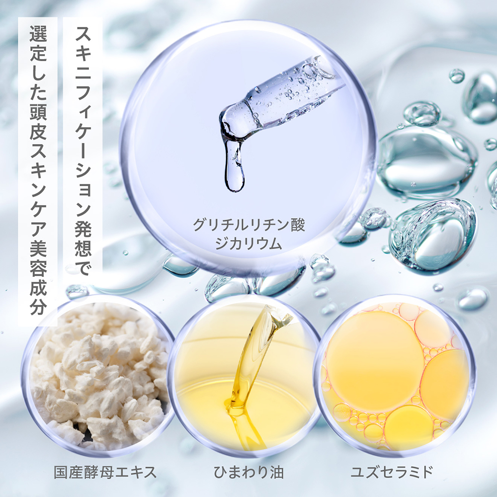 頭皮スキンケア成分「マルトース・ショ糖縮合物(オリゴ糖由来)*¹」と「広島県産エゴマ葉エキス*¹」を配合し、うるおいを補いながら水分を保ち、バリア機能をサポート。美髪の土台*²となる健やかな頭皮環境へ導きます。